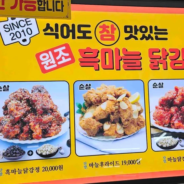 흑마늘닭강정의 대표 메뉴는 기본 흑마늘닭강정으로, 가격은 20,000원이랍니다. 이 외에도 다양한 사이드 메뉴가 있어요. 예를 들어, 고소한 아몬드가 얹힌 닭강정은 19,000원이에요.