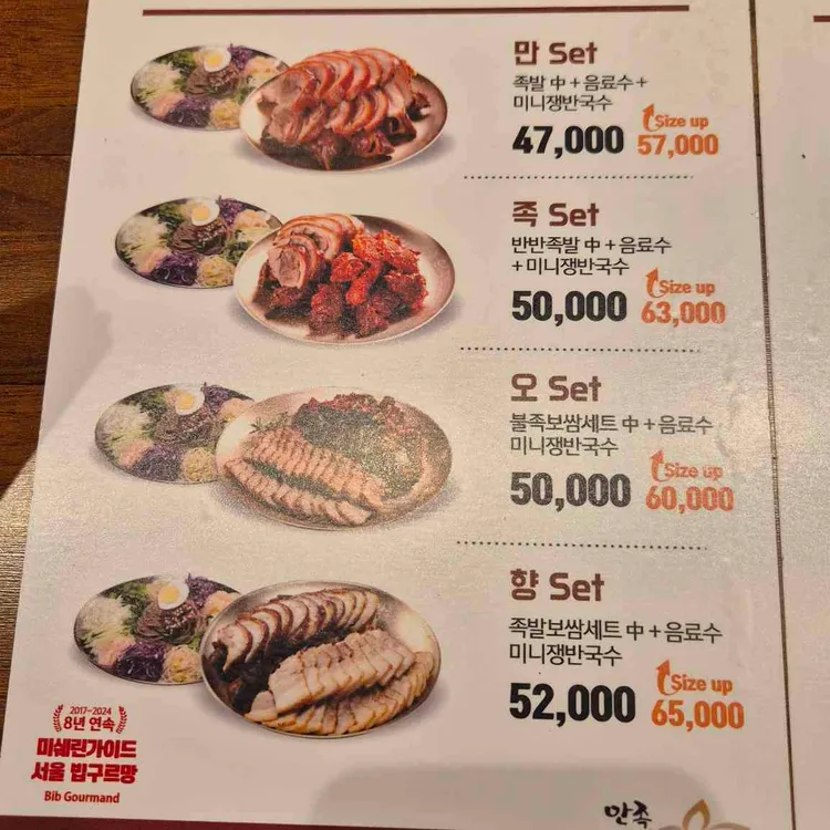 이곳의 메뉴는 다양하지만, 특히 추천하고 싶은 메뉴는 족발과 보쌈 세트입니다. 족발은 부드럽고 잡내가 전혀 없어서 정말 맛있어요. 가격은 다음과 같아요: