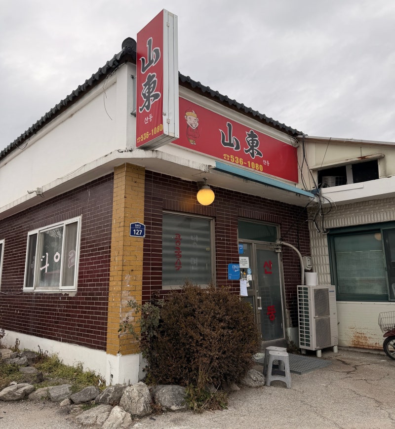 산둥은 포천의 이동면에 위치해 있어요. 외관은 아담하면서도 눈에 띄는 빨간색 간판이 인상적이에요.