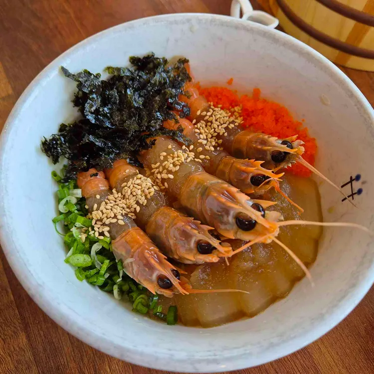 이제 음식 리뷰를 해볼게요. 첫 번째로 소개할 메뉴는 '딱새우장비빔밥'이에요. 신선한 딱새우가 올라가 있어 비주얼이 정말 화려해요.