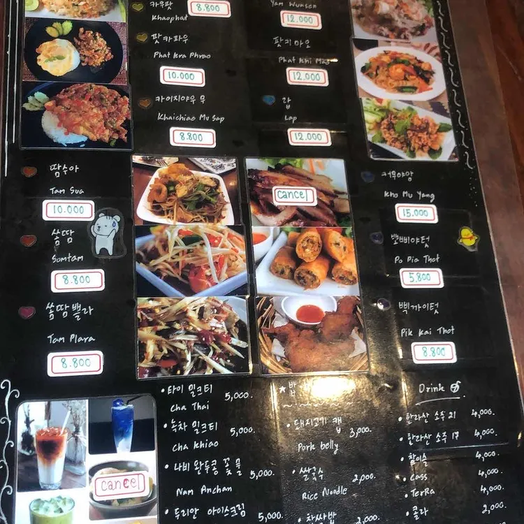 이곳의 대표 메뉴는 당연히 팟타이인데요, 가격은 약 10,000원 정도로, 양도 푸짐하고 맛도 일품이에요. 팟타이 외에도 다양한 태국 요리가 준비되어 있는데, 그 중에서도 그린 커리와 톰얌꿍도 추천해요. 그린 커리는 약간 매콤하면서도 깊은 맛이 나고, 톰얌꿍은 새우와 각종 해산물이 들어가서 시원하고 개운한 맛이 일품이에요. 메뉴판에는 다양한 요리와 가격이 나와 있어서 선택하기도 쉬워요.