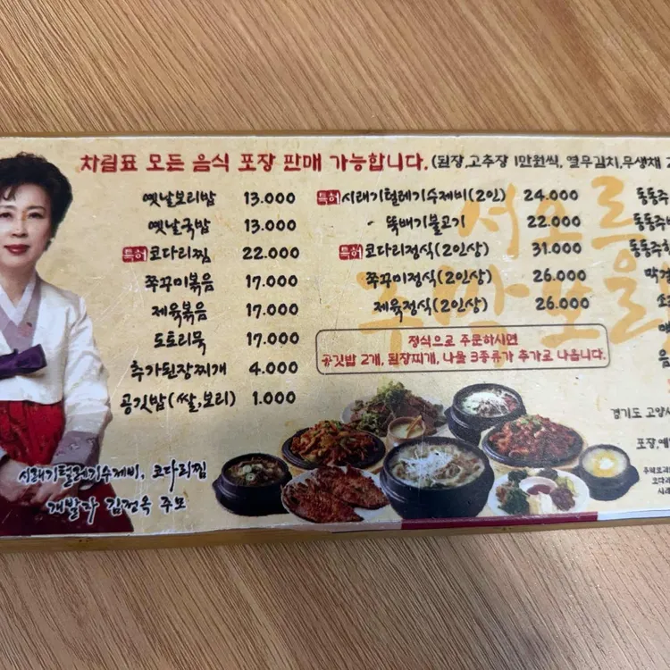 주막보리밥의 메뉴는 다양하고 가격도 합리적이에요. 특히 추천하는 메뉴는 '엣날보리밥'으로, 가격은 13,000원이랍니다. 이 외에도 '코다리찜'은 22,000원, '푸꾸리볶음'은 17,000원이에요. 더 큰 포션을 원하신다면 '해코다리정식'은 31,000원, '제육정식'은 26,000원으로 제공된답니다. 메뉴판은 보기에도 예쁘고, 다양한 요리 사진이 함께 있어 선택하는 재미가 쏠쏠해요.